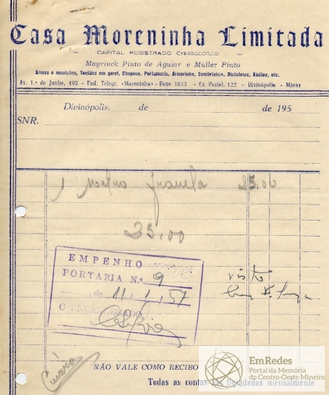 FICA O SR. CHEFE DO SERVIÇO DE FAZENDA AUTORIZADO A PAGAR AO SR. CASA MORENINHA LTDA A QUANTIA DE VINTE E CINCO CRUZEIROS PROVENIENTE DE 1 METRO DE FLANELA PARA ENCERAR.