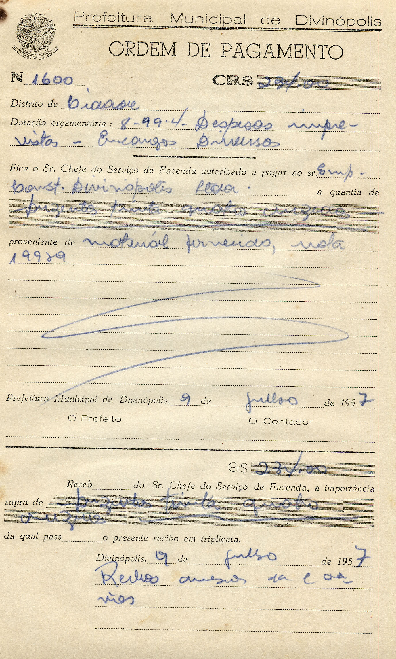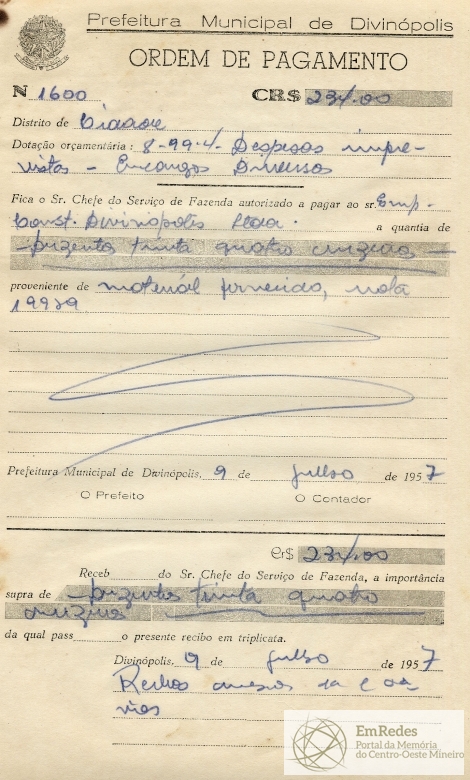 PREFEITURA MUNICIPAL DE DIVINÓPOLIS, 09 DE JULHO DE 1957