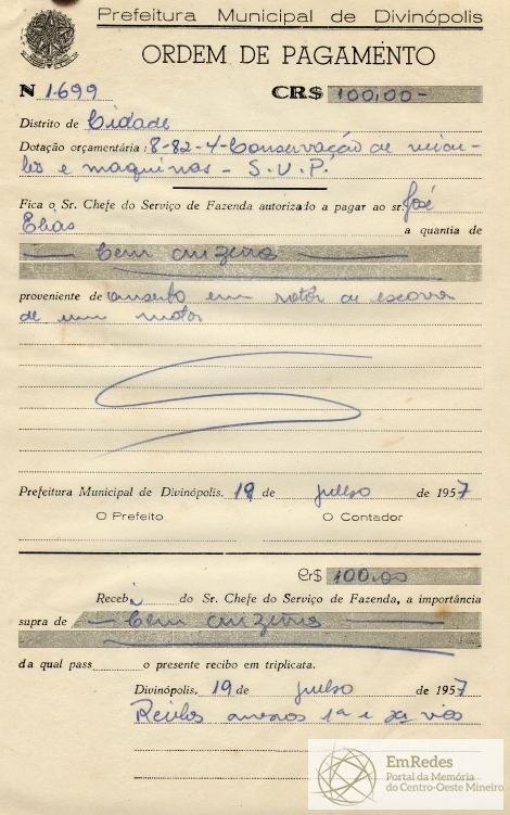 RECEBI DO SR. CHEFE DO SERVIÇO DE FAZENDA, A IMPORTÂNCIA DE CEM CRUZEIROS DA QUAL PASSO O PRESENTE RECIBO EM TRIPLICATA.
