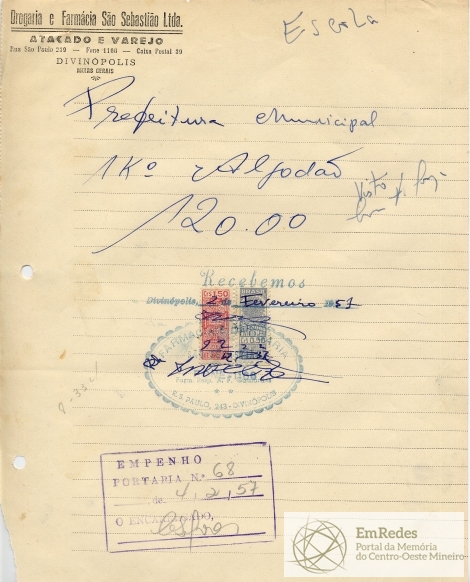 FICA O SR. CHEFE DO SERVIÇO DE FAZENDA AUTORIZADOA PAGAR AO SR.DROGARIA E FARMÁCIA SÃO SEBASTIÃO A QUANTIA DE CENTO E VINTE CRUZEIROS PROVENIENTE DE ALGODÃO.