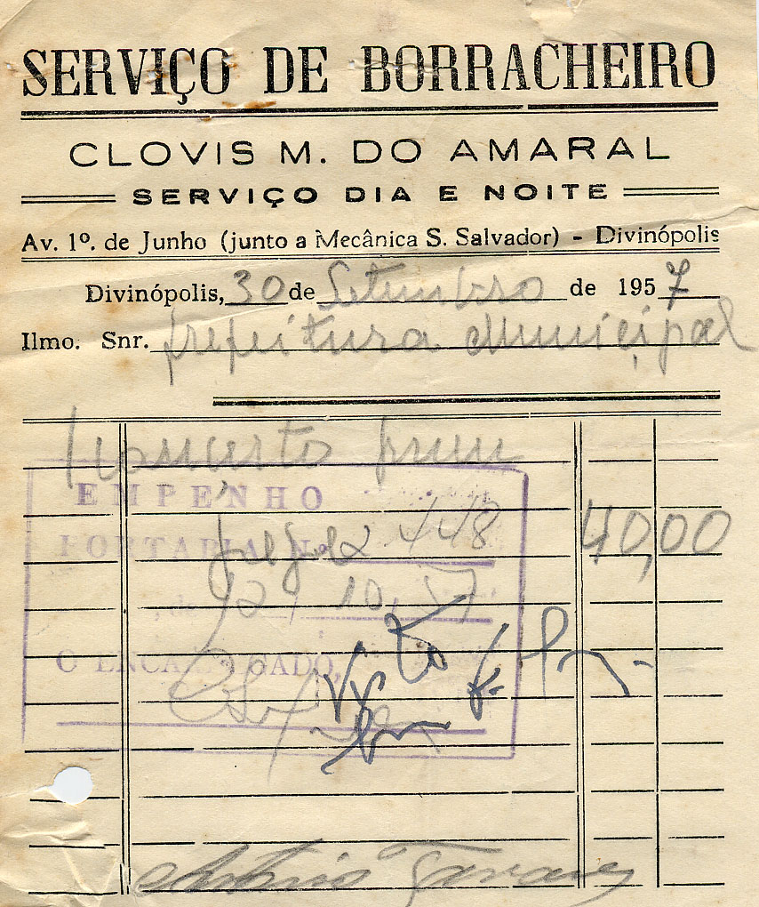 FICA O SR. CHEFE DO SERVIÇO DE FAZENDA AUTORIZADO A PAGAR AO SR. CLÓVIS M. DO AMARAL, A QUANTIA DE QUARENTA CRUZEIROS PROVENIENTE DE 1 CONSERTO PNEU.