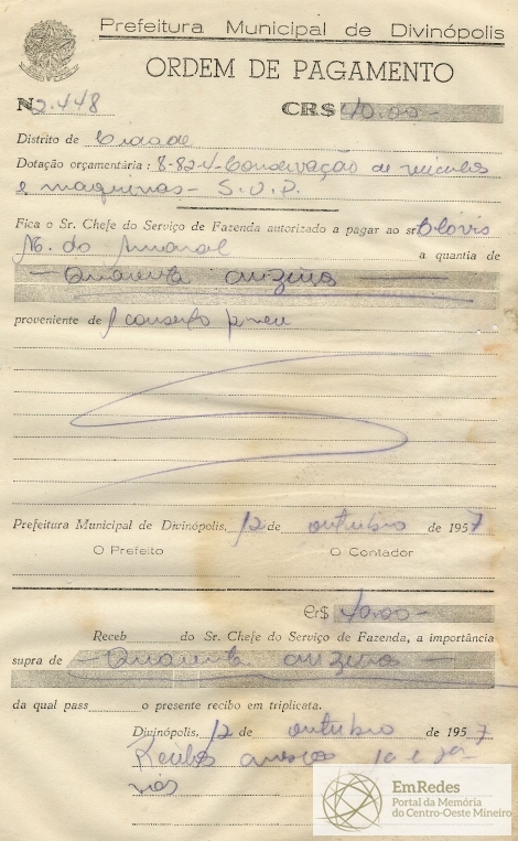 RECEBI DO SR. CHEFE DO SERVIÇO DE FAZENDA, A IMPORTÂNCIA SUPRA DE QUARENTA CRUZEIROS DA QUAL PASSO O PRESENTE RECIBO EM TRIPLICATA.