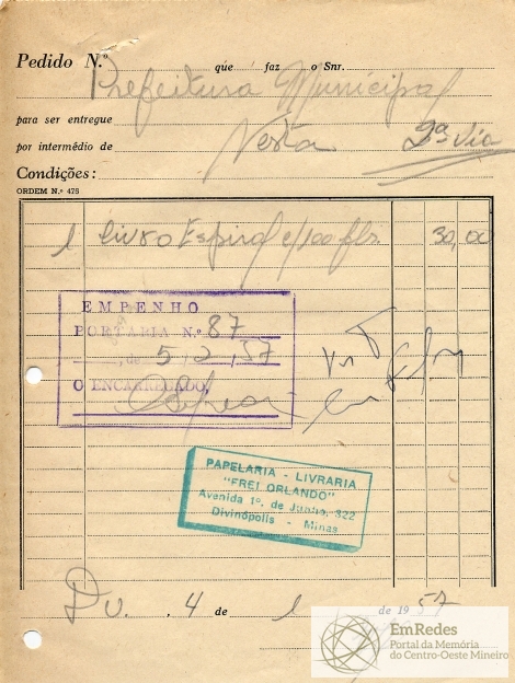 FICA O SR CHEFE DO SERVIÇO DE FAZENDA AUTORIZADO A PAGAR AO SR.LIVRARIA FREI ORLANDO A QUANTIA DE TRINTA CRUZEIROS PROVENIENTE DE 01 LIVRO ESPECIAL