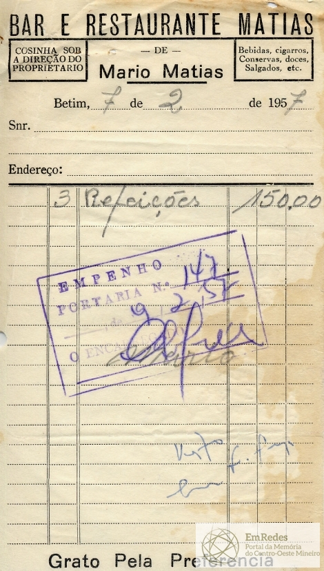 FICA O SR CHEFE DO SERVIÇO DE FAZENDA AUTORIZADO A PAGAR AO SR. MÁRIO MATIAS A QUANTIA DE CENTO E CINQUENTA CRUZEIROS PROVENIENTE DE 03 REFEIÇÕES.