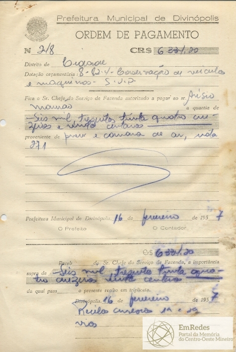 PREFEITURA MUNICIPAL DE DIVINÓPOLIS, 16 DE FEVEREIRO DE 1957