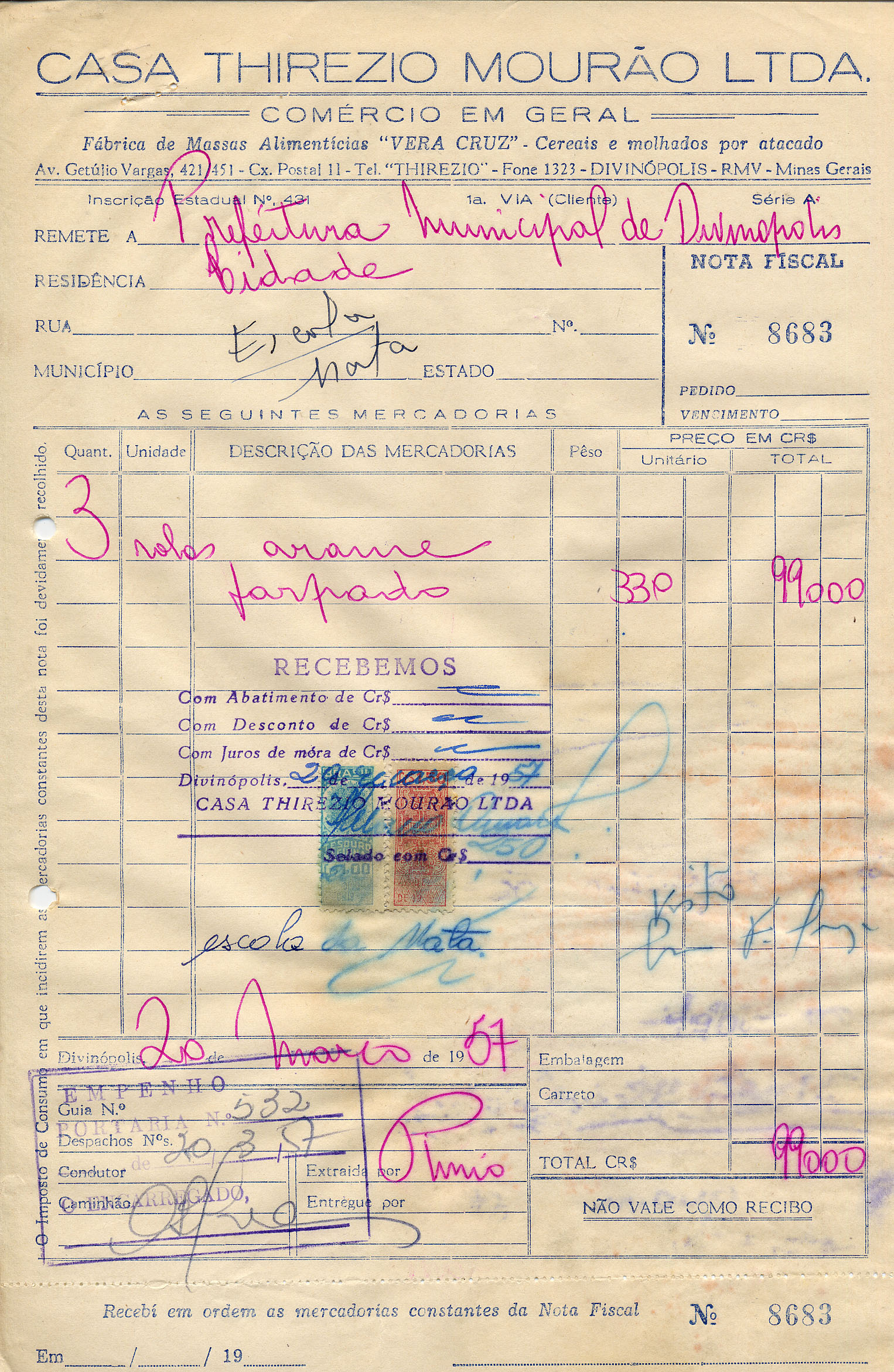 FICA O SR CHEFE DO SERVIÇO DE FAZENDA AUTORIZADO A PAGAR AO SR. CASA THIRÉZIO MOURÃO LTDA. A QUANTIA DE NOVECENTOS E NOVENTA CRUZEIROS PROVENIENTE DE ARAME