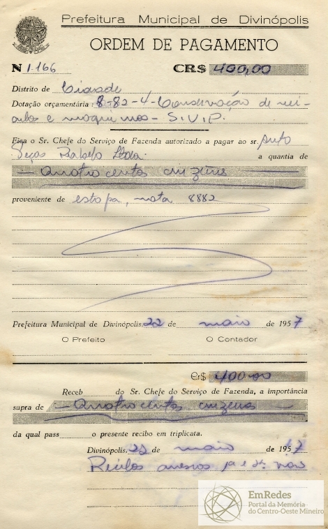 RECEBI DO SR. CHEFE DO SERVIÇO DE FAZENDA, A IMPORTÂNCIA SUPRA DE QUATROCENTOS CRUZEIROS DA QUAL PASSO O PRESENTE RECIBO EM TRIPLICATA.