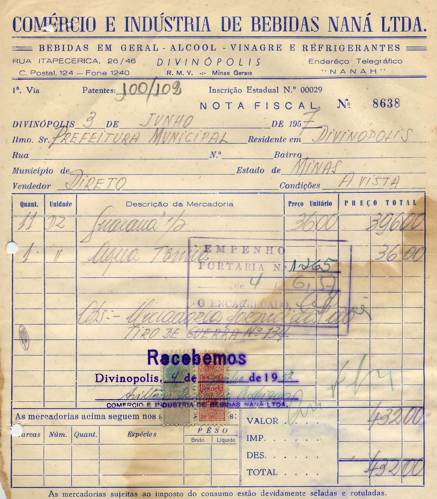 FICA O SR. CHEFE DO SERVIÇO DE FAZENDA AUTORIZADO A PAGAR AO SR. COM. E IND. BEBIDAS NANÁ LTDA. A QUANTIA DE QUATROCENTOS TRINTA DOIS CRUZEIROS PROVENIENTE DE GUARANÁ E ÁGUA TÔNICA.