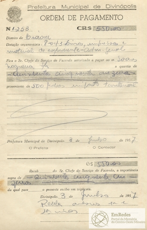 RECEBI DO SR. CHEFE DO SERVIÇO DE FAZENDA, A IMPORTÂNCIA SUPRA DE QUINHENTOS CINQUENTA CRUZEIROS DA QUAL PASSO O PRESENTE RECIBO EM TRIPLICATA.