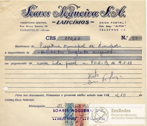 PREFEITURA MUNICIPAL DE DIVINÓPOLIS - ORDEM DE PAGAMENTO Nº 1253 CR$ 550,00 DISTRITO DE CIDADE DOTAÇÃO ORÇAMENTÁRIA 8-04-3 LIVROS, IMPRESSOS E MATERIAL DE EXPEDIENTE , ADMINISTRAÇÃO GERAL FICA O SR. CHEFE DO SERVIÇO DE FAZENDA AUTORIZADO A PAGAR AO SR. SOARES NOGUEIRA S/A A QUANTIA DE QUINHENTOS CINQUENTA CRUZEIROS PROVENIENTE DE 500 FICHAS DE IMPOSTO TERRITORIAL PREFEITURA MUNICIPAL DE DIVINÓPOLIS, 03 DE JUNHO DE 1957 RECEBI DO SR. CHEFE DO SERVIÇO DE FAZENDA, A IMPORTÂNCIA SUPRA DE QUINHENTOS CINQUENTA CRUZEIROS DA QUAL PASSO O PRESENTE RECIBO EM TRIPLICATA. DIVINÓPOLIS, 03 DE JUNHO DE 1957.