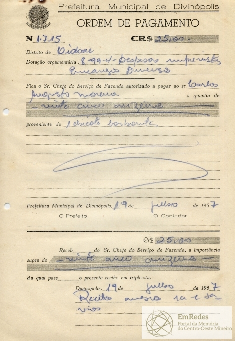 RECEBI DO SR. CHEFE DO SERVIÇO DE FAZENDA, A IMPORTÂNCIA SUPRA DE VINTE CINCO CRUZEIROS DA QUAL PASSO O PRESENTE RECIBO EM TRIPLICATA.