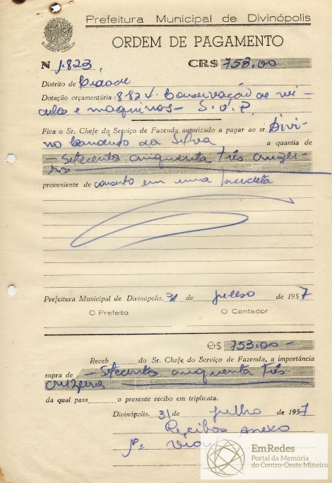 RECEBI DO SR. CHEFE DO SERVIÇO DE FAZENDA, A IMPORTÂNCIA SUPRA DE SETECENTOS CINQUENTA TRÊS CRUZEIROS DA QUAL PASSO O PRESENTE RECIBO EM TRIPLICATA.
