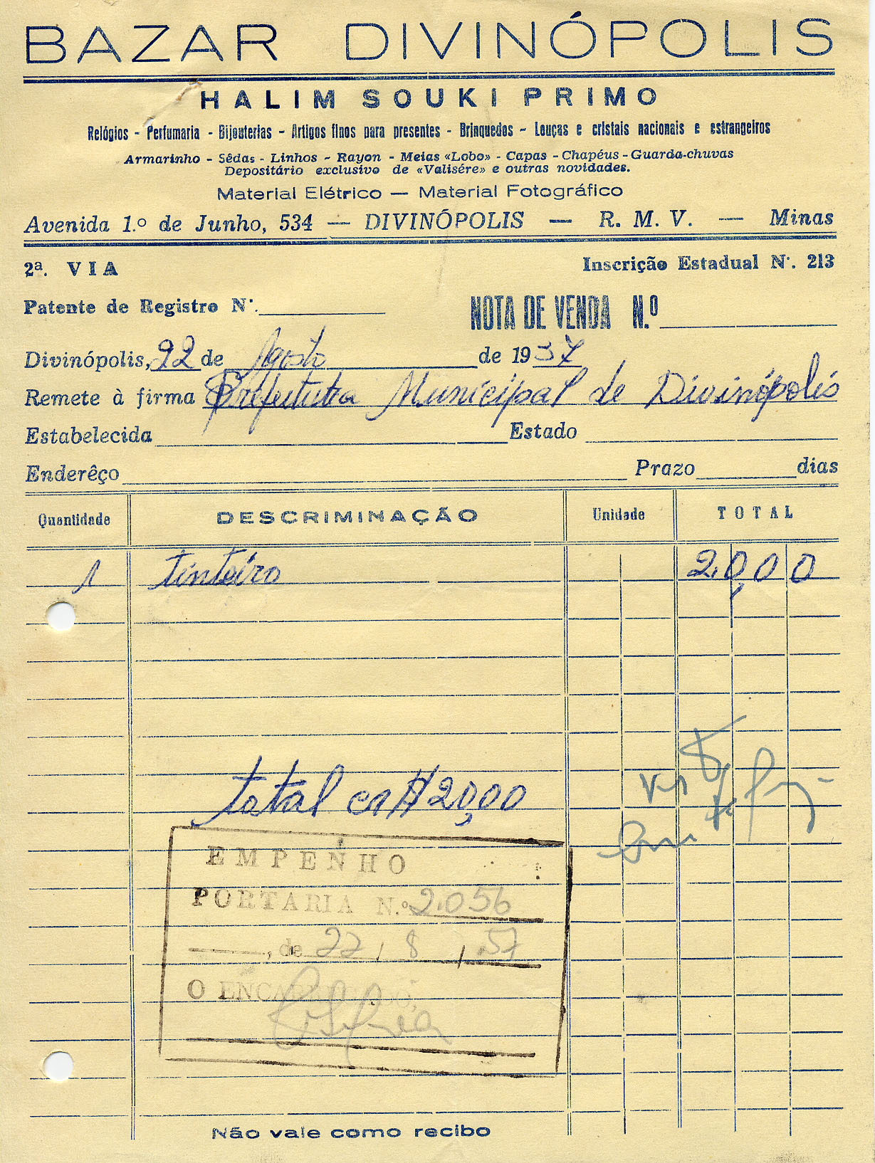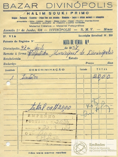 FICA O SR. CHEFE DO SERVIÇO DE FAZENDA AUTORIZADO A PAGAR AO SR. HALIM SOUKI PRIMO A QUANTIA DE VINTE CRUZEIROS PROVENIENTE DE 01 TINTEIRO.