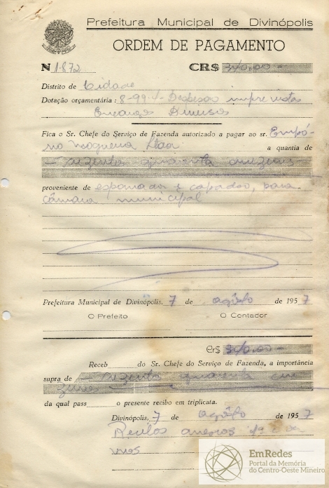 PREFEITURA MUNICIPAL DE DIVINÓPOLIS, 07 DE AGOSTO DE 1957.
