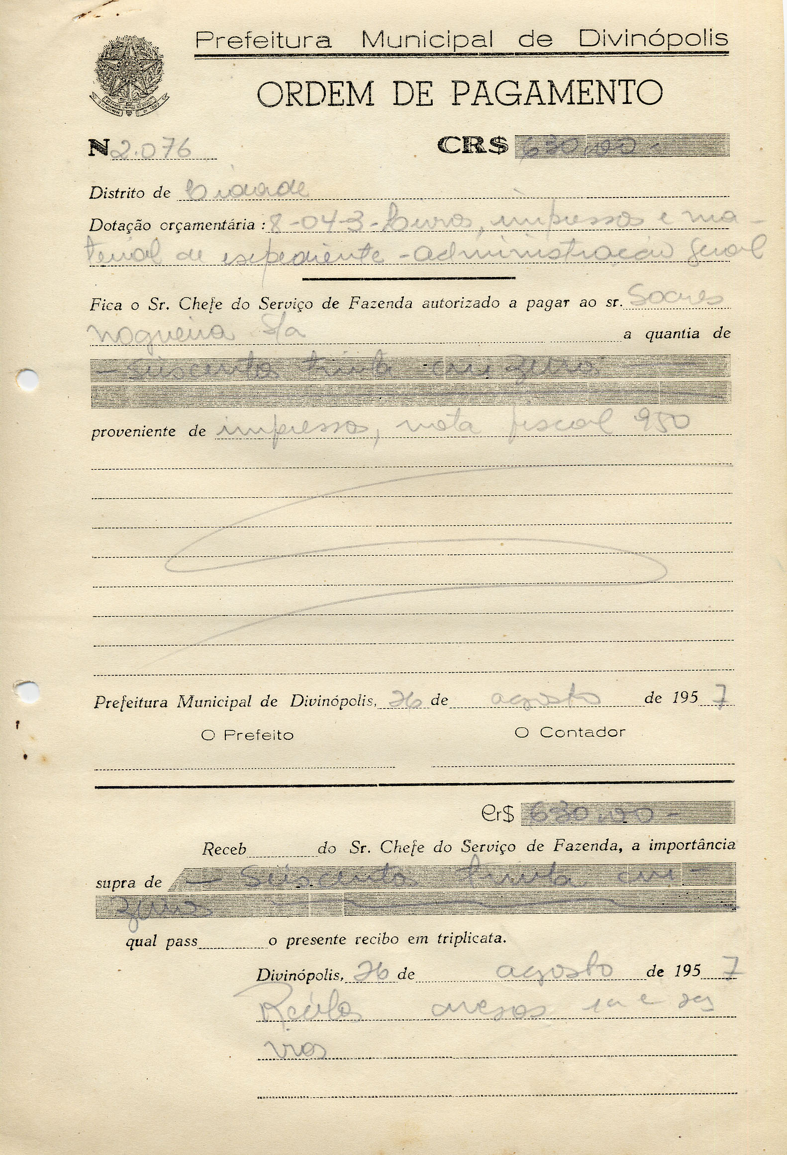 RECEBI DO SR. CHEFE DO SERVIÇO DE FAZENDA, A IMPORTÂNCIA SUPRA DE SEISCENTOS TRINTA CRUZEIROS QUAL PASSO O PRESENTE RECIBO EM TRIPLICATA.