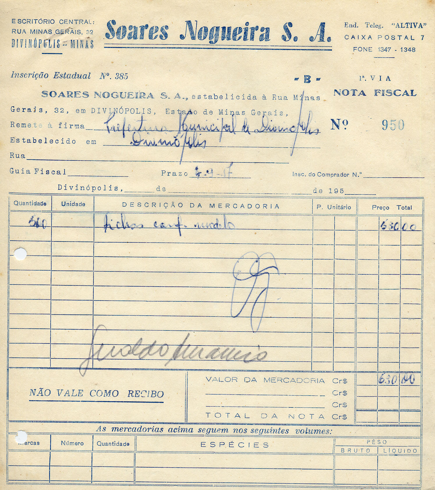 FICA O SR. CHEFE DE SERVIÇO DE FAZENDA AUTORIZADO A PAGAR AO SR.SOARES NOGUEIRA S/A. A QUANTIA DE SEISCENTOS E TRINTA CRUZEIROS PROVENIENTE DE IMPRESSOS.