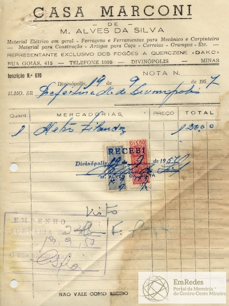 PREFEITURA MUNICIPAL DE DIVINÓPOLIS, 19 DE SETEMBRO DE 1957.