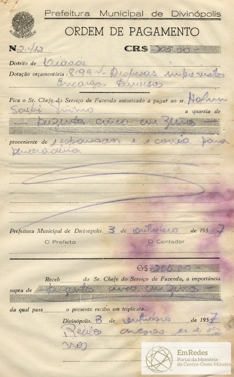 PREFEITURA MUNICIPAL DE DIVINÓPOLIS, 03 DE OUTUBRO DE 1957.