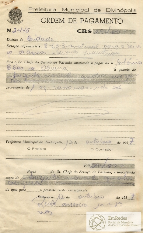 PREFEITURA MUNICIPAL DE DIVINÓPOLIS, 12 DE OUTUBRO DE 1957.
