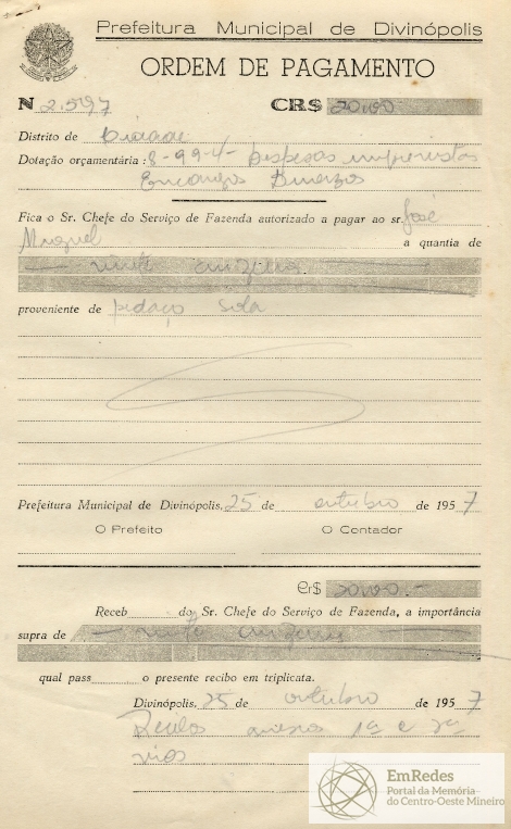 PREFEITURA MUNICIPAL DE DIVINÓPOLIS, 25 DE OUTUBRO DE 1957.