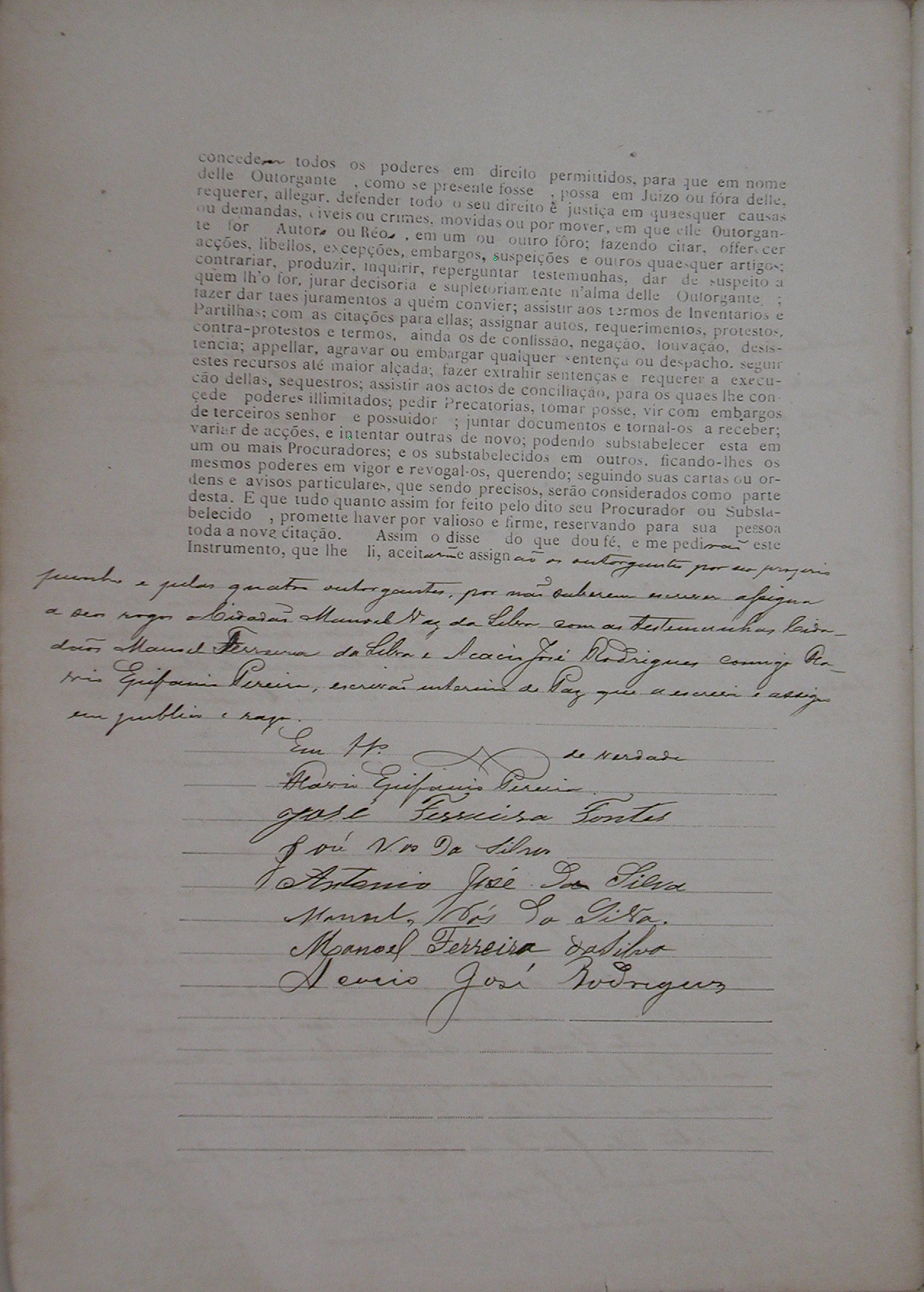 PROCURAÇÃO BASTANTE QUE FAZEM JOSÉ FERREIRA FONTES E SUA MULHER DONA PAULA CÂNDIDA DE JESUS, ANTÔNIO JOSÉ DA SILVA E SUA MULHER DONA AUGUSTA SOARES DE SIQUEIRA, JOSÉ VAZ DA SILVA E SUA MULHER DONA ROZA MARIA DE JESUS E DONA MARIA FRANCISCA DE JESUS, AOS 26 DIAS DO MÊS DE ABRIL DE 1898, CONSTITUEM SEU BASTANTE PROCURADOR MAJOR AFFONSO HENRIQUE LAMONNIER RESIDENTE NA CIDADE DE ITAPECERICA PARA A DIVIZÃO (SIC) OU PARTILHA DA FAZENDA DA MATTA DOS COQUEIROS NESTE DISTRITO.