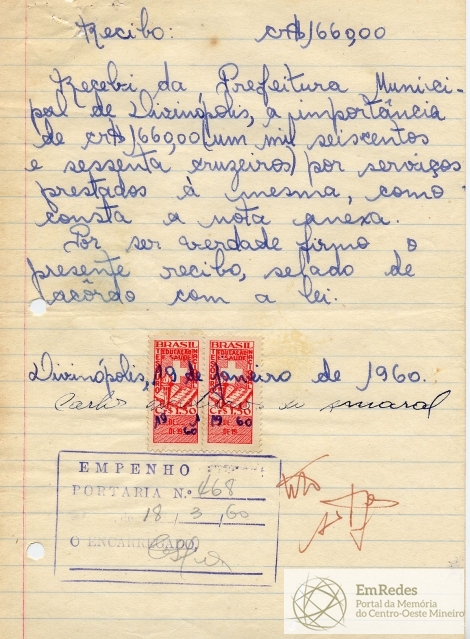 RECEBI DO SR. CHEFE DO SERVIÇO DE FAZENDA, A IMPORTÂNCIA SUPRA DE UM MIL, SEISCENTOS SESSENTA CRUZEIROS DA QUAL PASSO O PRESENTE RECIBO TRIPLICATA.