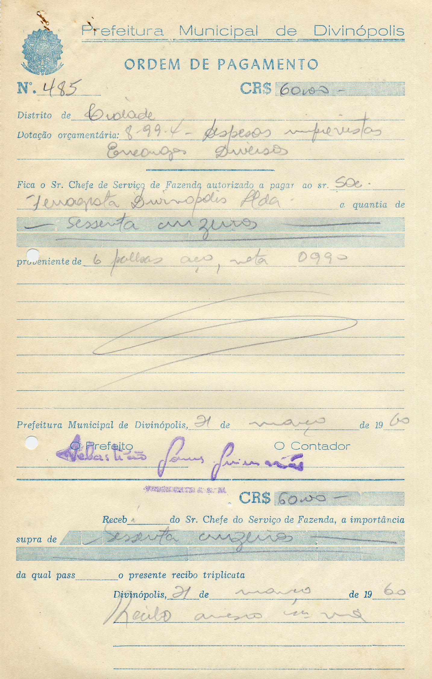RECEBI DO SR. CHEFE DO SERVIÇO DE FAZENDA, A IMPORTÂNCIA SUPRA DE SESSENTA CRUZEIROS DA QUAL PASSO O PRESENTE RECIBO TRIPLICATA.