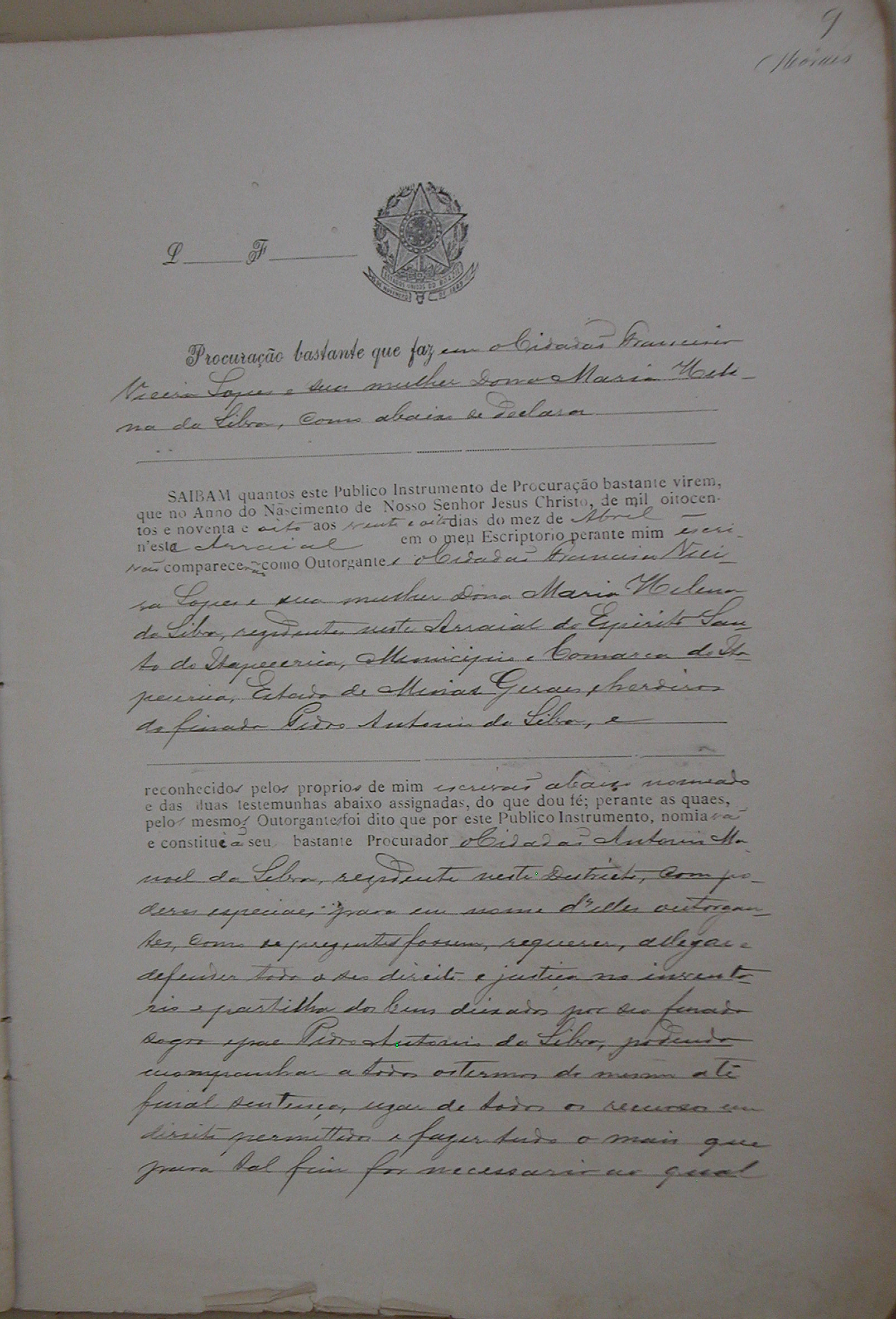 PROCURAÇÃO BASTANTE QUE FAZEM FRANCISCO VIEIRA LOPES E SUA MULHER DONA MARIA HELENA DA SILVA, AOS 28 DIAS DE ABRIL DE 1898,E CONSTITUE SEU BASTANTE PROCURADOR O CIDADÃO ANTÔNIO MANOEL DA SILVA RESIDENTE NESTE DISTRITO PARA REQUERER PARTILHA E INVENTÁRIO DOS BENS DEIXADOS POR SEU FINADO SOGRO PEDRO ANTÔNIO DA SILVA.