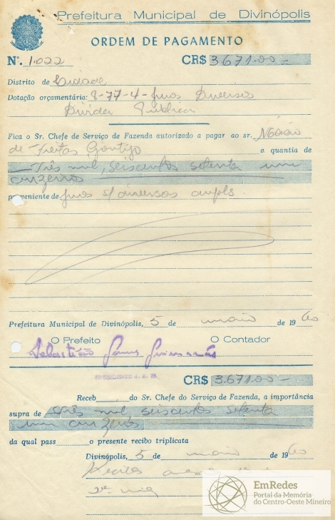 RECEBI DO SR. CHEFE DO SERVIÇO DE FAZENDA, A IMPORTÂNCIA SUPRA DE TRÊS MIL, SEISCENTOS E SETENTA E SETE CRUZEIROS DA QUAL PASSO O PRESENTE RECIBO TRIPLICATA.