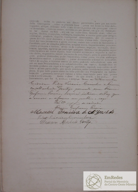 PROCURAÇÃO BASTANTE QUE FAZ MANOEL FERREIRA DE AZEVEDO AOS 08 DIAS DO MÊS DE ABRIL DE 1899, NESTE ARRAIAL E CONSTITUI SEUS BASTANTES PROCURADORES FRANCISCO DOMINGOS GONTIJO RESIDENTE EM RIBEIRÃO VERMELHO E A FIRMA SOCIAL BOTELHO MACIEL E COMPANHIA, NO RIO DE JANEIRO COM PODERES PARA OBTER E RECEBER DA VENERÁVEL ORDEM TERCEIRA DA PENITENCIÁRIA DE SÃO FRANCISCO NO RIO DE JANEIRO A PENSÃO, DOAÇÃO OU AUXILIO.
