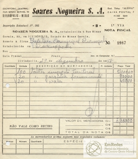 FICA O SR. CHEFE DO SERVIÇO DE FAZENDA AUTORIZADO A PAGAR AO SR. SOARES NOGUEIRA S/A A QUANTIA DE DEZENOVE MIL, SETECENTOS E CINQUENTA CRUZEIROS PROVENIENTE DE IMPRESSOS FORNECIDOS.