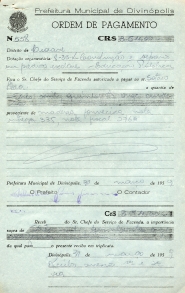 PREFEITURA MUNICIPAL DE DIVINÓPOLIS- ORDEM DE PAGAMENTO Nº 558 CR$ 3.511,00 DISTRITO DE CIDADE DOTAÇÃO ORÇAMENTÁRIA 8-33-4 CONSTRUÇÃO E REPAROS EM PRÉDIOS ESCOLARES, EDUCAÇÃO PÚBLICA. FICA O SR. CHEFE DO SERVIÇO DE FAZENDA AUTORIZADO A PAGAR AO SR.SOTACO LTDA. A QUANTIA DE TRÊS MIL, QUINHENTOS E ONZE CRUZEIROS PROVENIENTE DE MADEIRA FORNECIDA. PREFEITURA MUNICIPAL DE DIVINÓPOLIS, 31 DE MARÇO DE 1959. RECEBI DO SR. CHEFE DO SERVIÇO DE FAZENDA, A IMPORTÂNCIA SUPRA DE TRÊS MIL, QUINHENTOS E ONZE CRUZEIROS DA QUAL PASSO O PRESENTE RECIBO EM TRIPLICATA. DIVINÓPOLIS, 31 DE MARÇO DE 1959.
