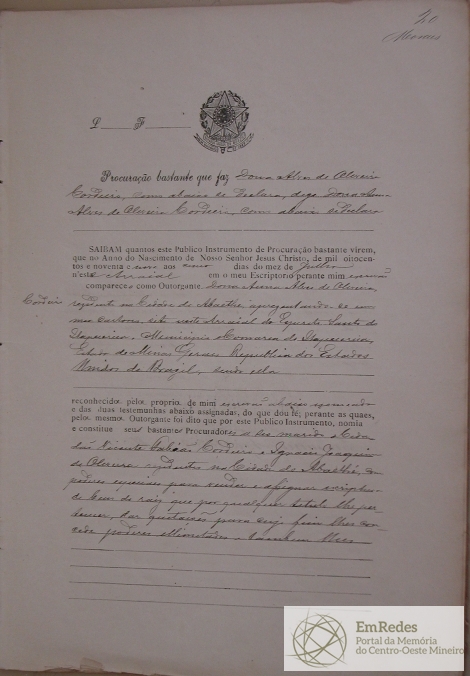 PROCURAÇÃO BASTANTE QUE FAZ DONA ÁUREA ALVES DE OLIVEIRA CORDEIRO AOS 5 DIAS DE JULHO DE 1899, NESTE ARRAIAL E CONSTITUE SEUS BASTANTES PROCURADORES VICENTE FABIÃO CORDEIRO E IGNÁCIO JOAQUIM DE OLIVEIRA RESIDENTE NA CIDADE DE ABAETÉ COM PODERES PARA VENDER E ASSINAR ESCRITURAS DE BENS DE RAIZ QUE POR QUALQUER TITULO LHE PERTENCER.