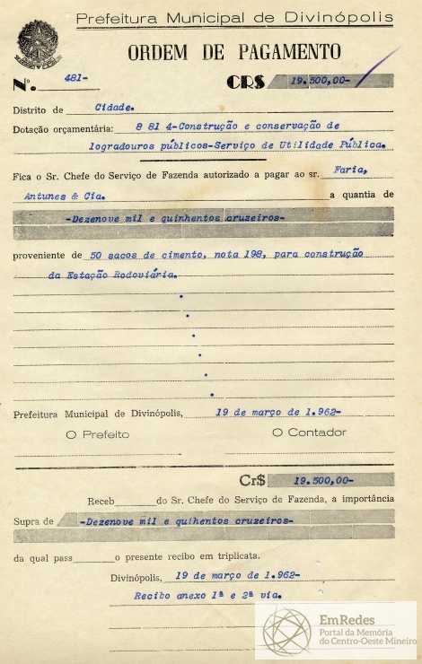 PREFEITURA MUNICIPAL DE DIVINÓPOLIS, 19 DE MARÇO DE 1962.