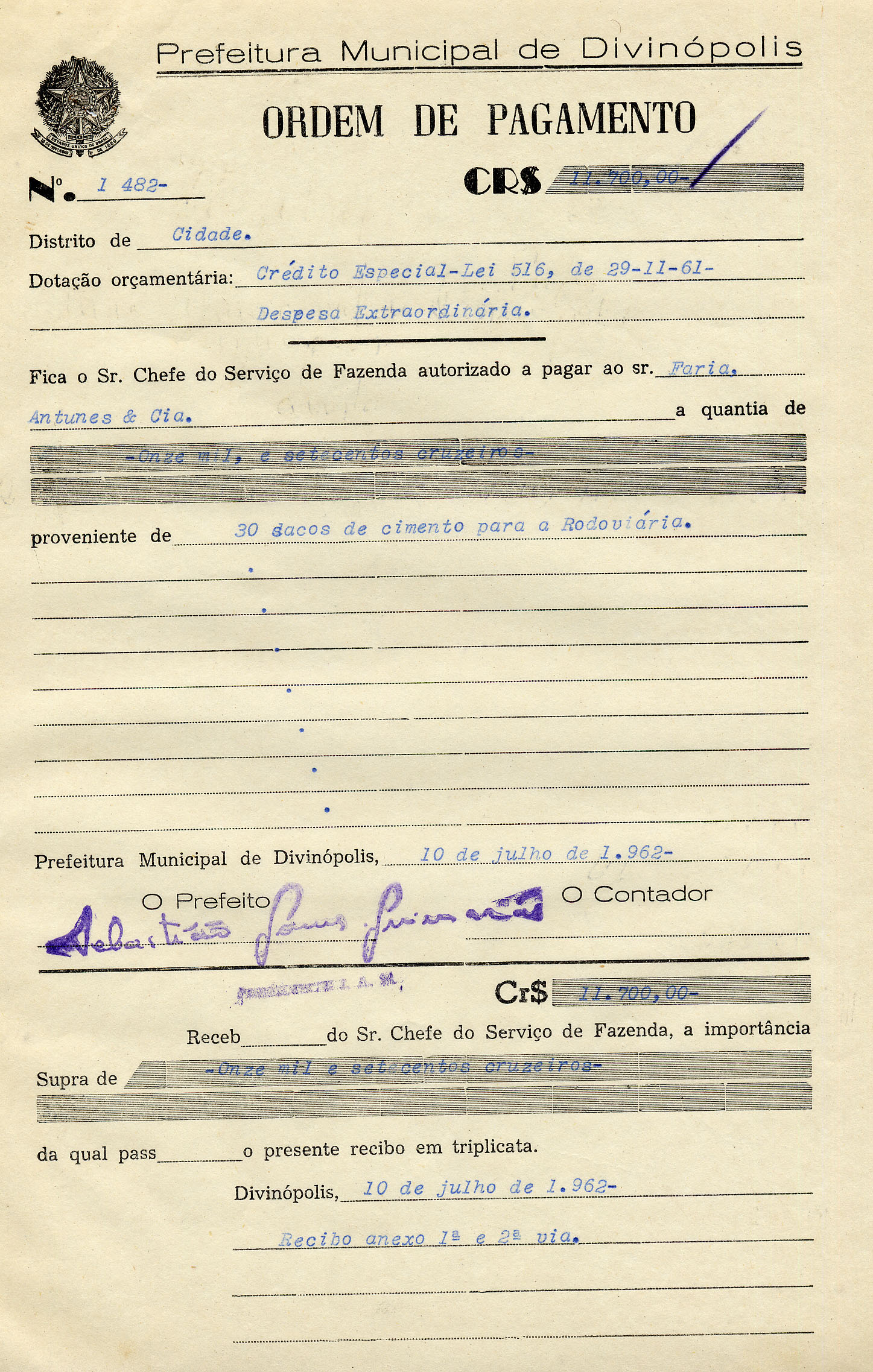 PREFEITURA MUNICIPAL DE DIVINÓPOLIS - ORDEM DE PAGAMENTO Nº 1482 CR$ 11.700,00 DISTRITO DE CIDADE DOTAÇÃO ORÇAMENTÁRIA: CRÉDITO ESPECIAL, LEI 516, DE 29/11/61 DESPESAS EXTRAORDINÁRIAS FICA O SR. CHEFE DO SERVIÇO DE FAZENDA AUTORIZADO A PAGAR AO SR. FARIA, ANTUNES E CIA. A QUANTIA DE ONZE MIL E SETECENTOS CRUZEIROS PROVENIENTE DE 30 SACOS DE CIMENTO PARA RODOVIÁRIA. PREFEITURA MUNICIPAL DE DIVINÓPOLIS, 10 DE JULHO DE 1962. RECEBI DO SR. CHEFE DO SERVIÇO DE FAZENDA A IMPORTÂNCIA SUPRA DE ONZE MIL E SETECENTOS CRUZEIROS DA QUAL PASSO O PRESENTE RECIBO EM TRIPLICATA. DIVINÓPOLIS, 10 DE JULHO DE 1962.