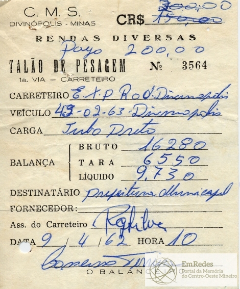 PREFEITURA MUNICIPAL DE DIVINÓPOLIS, 12 DE JULHO DE 1962.