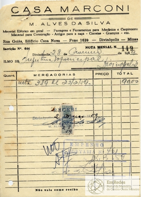 PREFEITURA MUNICIPAL DE DIVINÓPOLIS, 18 DE MARÇO DE 1959.
