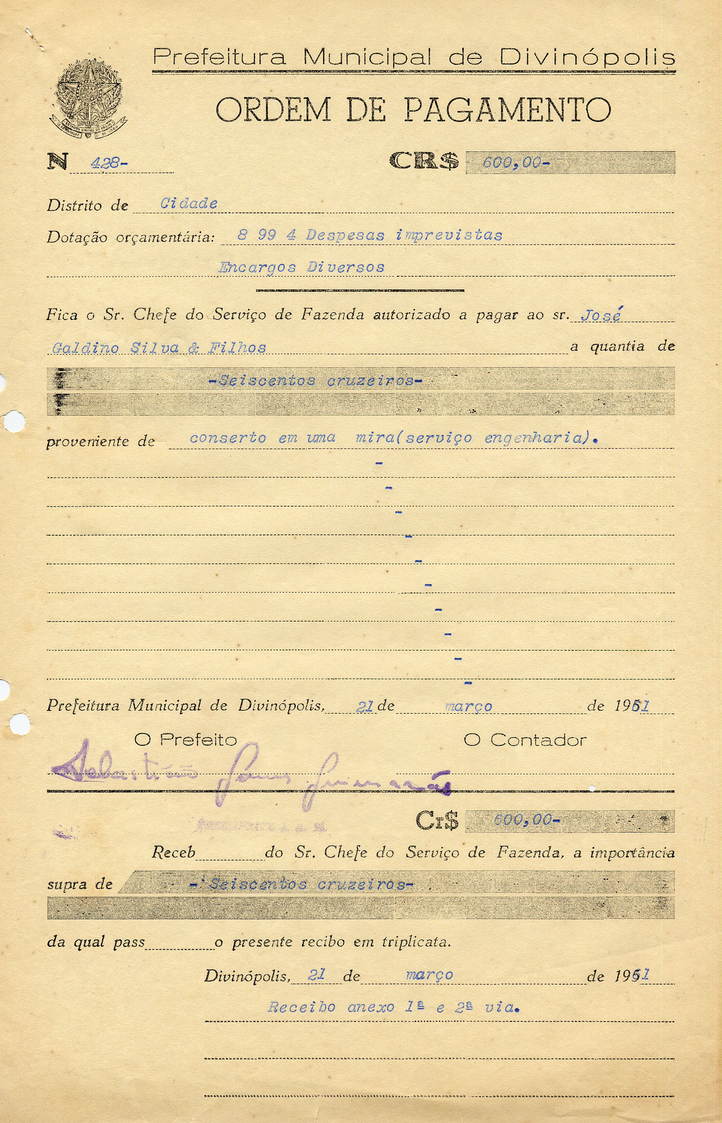 FICA O SR. CHEFE DO SERVIÇO DE FAZENDA AUTORIZADO A PAGAR AO SR.JOSÉ GALDINO SILVA & FILHOS A QUANTIA DE SEISCENTOS CRUZEIROS PROVENIENTE DE CONSERTO EM UMA MIRA (SERVIÇO ENGENHARIA).