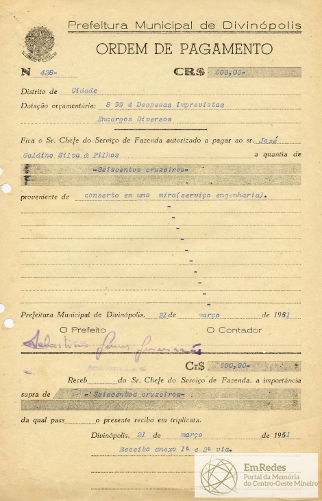RECEBI DO SR. CHEFE DO SERVIÇO DE FAZENDA A IMPORTÂNCIA SUPRA DE SEISCENTOS CRUZEIROS DA QUAL PASSO O PRESENTE RECIBO EM TRIPLICATA.