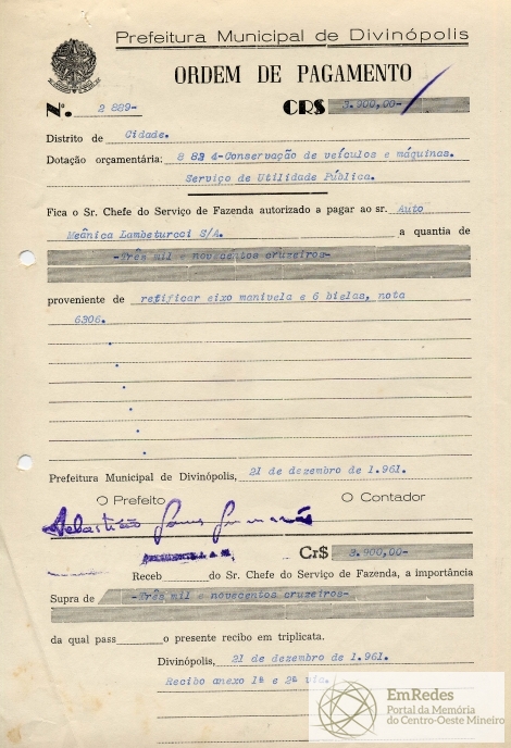 PREFEITURA MUNICIPAL DE DIVINÓPOLIS, 21 DE DEZEMBRO DE 1961.