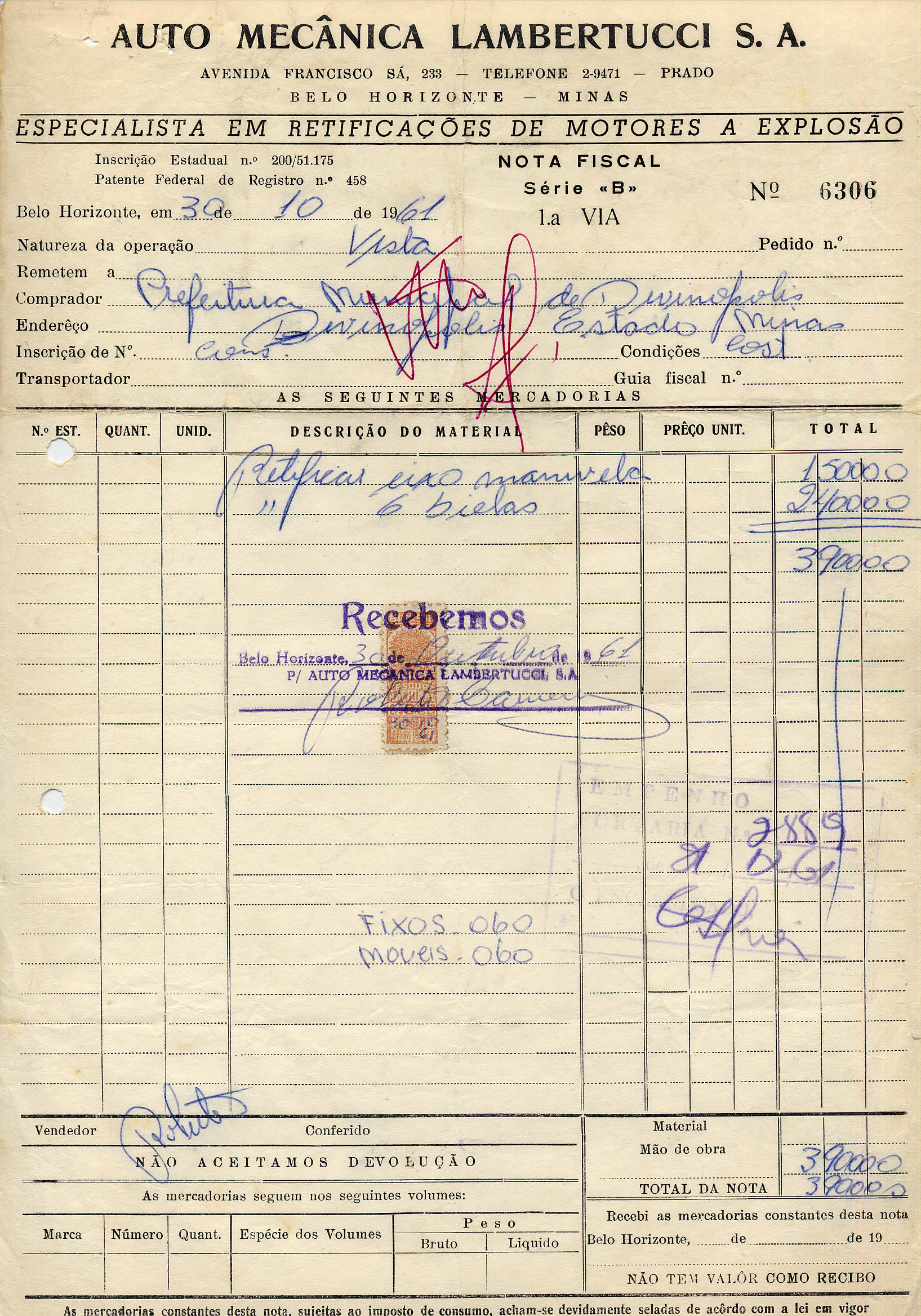 FICA O SR. CHEFE DO SERVIÇO DE FAZENDA AUTORIZADO A PAGAR AO SR. AUTO MECÂNICA LAMBERTUCCI S/A A QUANTIA DE TRÊS MIL E NOVECENTOS CRUZEIROS PROVENIENTE DE RETIFICAR EIXO MANIVELA E 6 BIELAS.