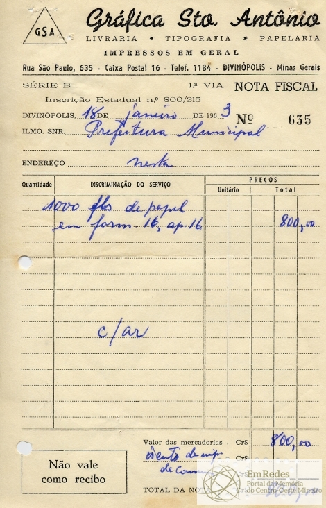 PREFEITURA MUNICIPAL DE DIVINÓPOLIS, 25 DE JANEIRO DE 1963.
