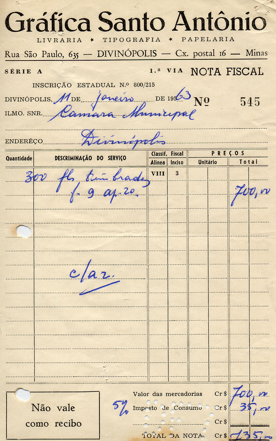 RECEBI DO SR. CHEFE DO SERVIÇO DE FAZENDA A IMPORTÂNCIA SUPRA DE DOIS MIL, QUINHENTOS E TRINTA E CINCO CRUZEIROS DA QUAL PASSO O PRESENTE RECIBO EM TRIPLICATA.