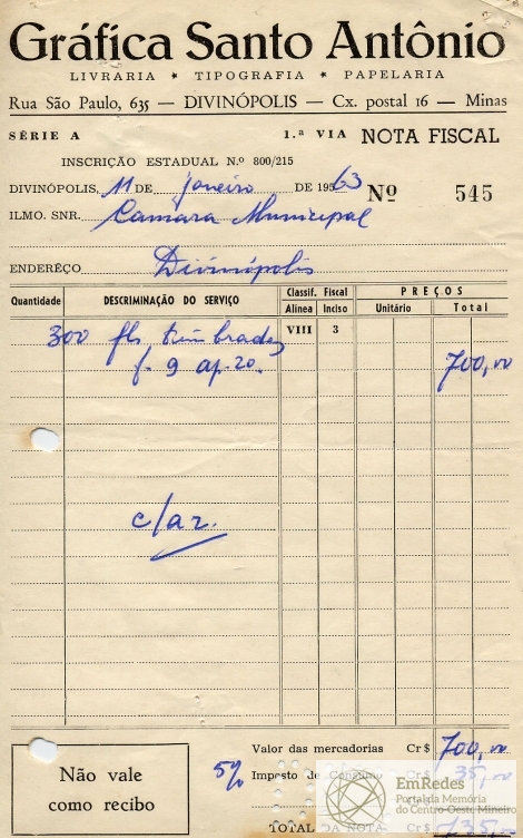 PREFEITURA MUNICIPAL DE DIVINÓPOLIS, 25 DE JANEIRO DE 1963.