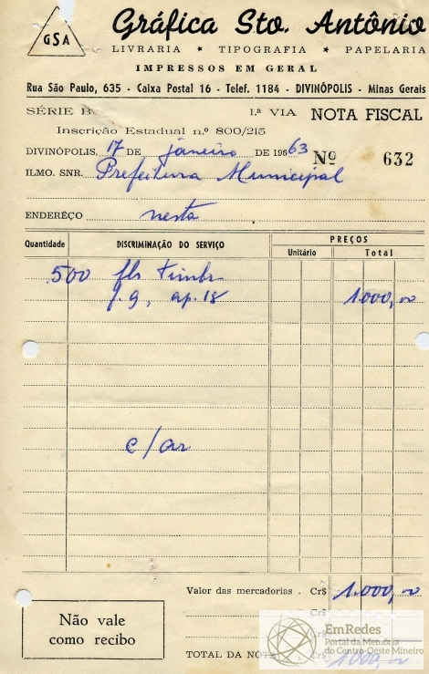 PREFEITURA MUNICIPAL DE DIVINÓPOLIS, 25 DE JANEIRO DE 1963.
