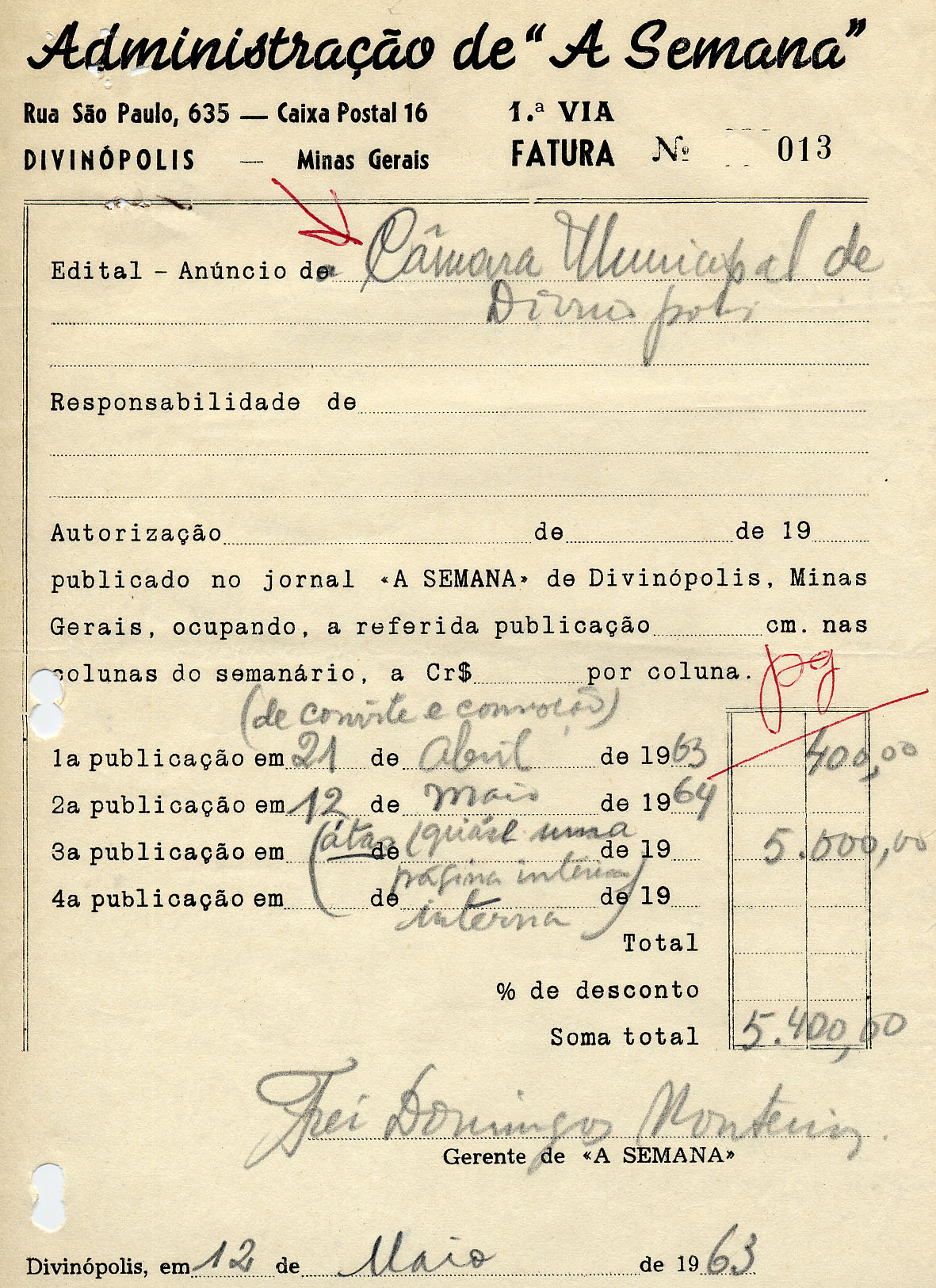 PREFEITURA MUNICIPAL DE DIVINÓPOLIS, 19 DE JUNHO DE 1963.