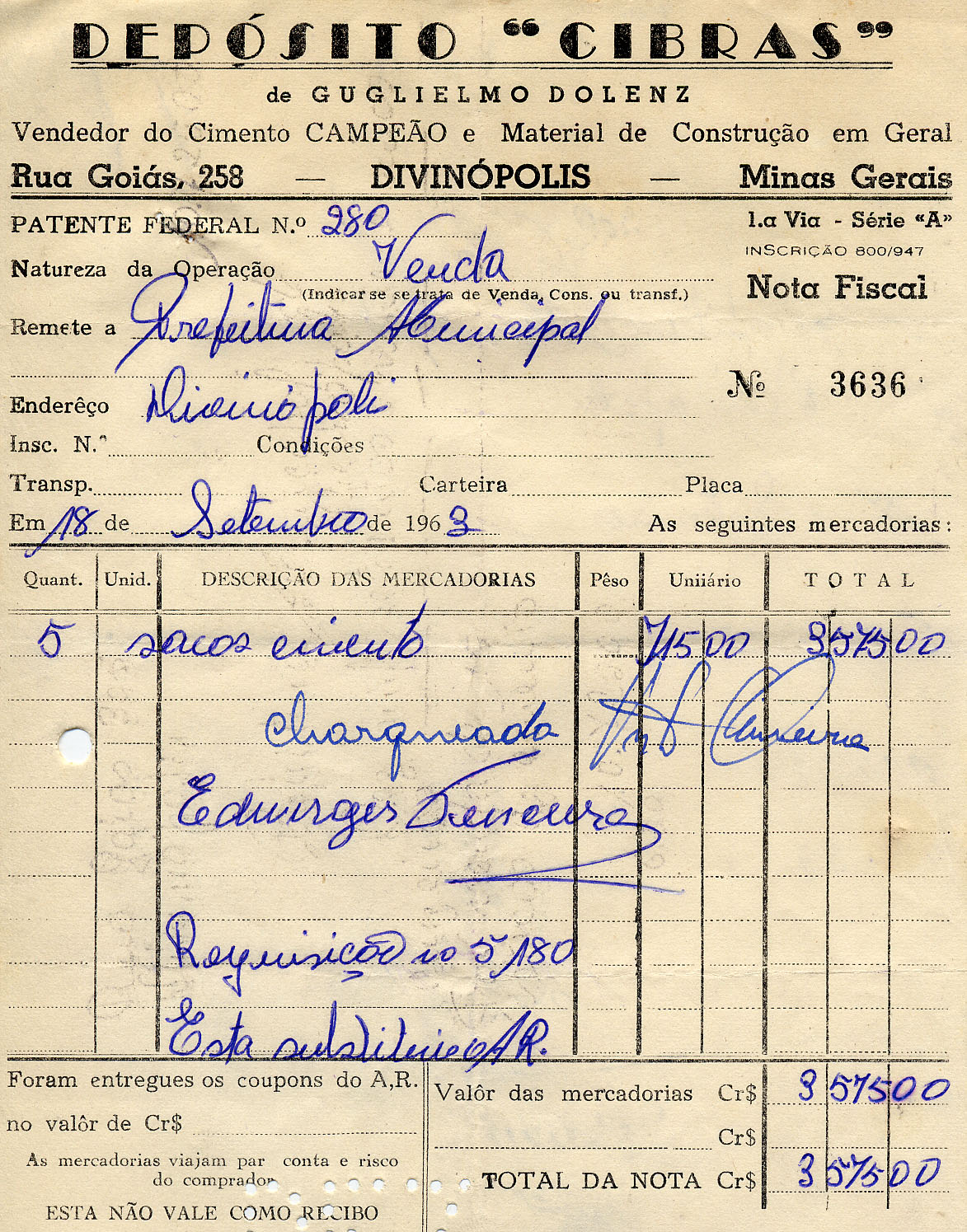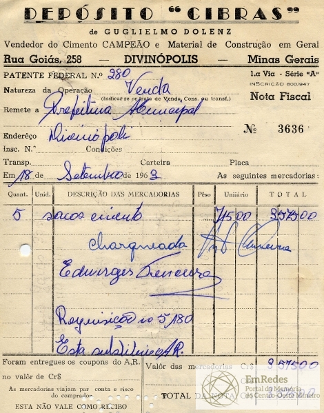PREFEITURA MUNICIPAL DE DIVINÓPOLIS, 16 DE OUTUBRO DE 1963.
