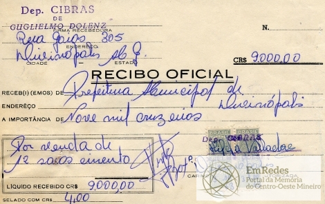 RECEBI DO SR. CHEFE DO SERVIÇO DE FAZENDA, A IMPORTÂNCIA SUPRA DE NOVE MIL CRUZEIROS DA QUAL PASSO O PRESENTE RECIBO EM TRIPLICATA.