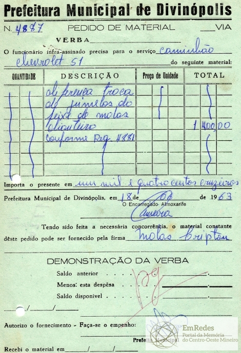 PREFEITURA MUNICIPAL DE DIVINÓPOLIS - ORDEM DE PAGAMENTO Nº 2632 CR$ 17.600,00 DISTRITO DE CIDADE DOTAÇÃO ORÇAMENTÁRIA: 8-82-4 CONSERVAÇÃO DE VEÍCULOS E MÁQUINAS FICA O SR. CHEFE DO SERVIÇO DE FAZENDA AUTORIZADO A PAGAR AO SR.ALBERTO DE CASTRO BAHIA A QUANTIA DE DEZESSETE MIL E SEISCENTOS CRUZEIROS PROVENIENTE DE FEIXES. PREFEITURA MUNICIPAL DE DIVINÓPOLIS, 18 DE OUTUBRO DE 1963. RECEBI DO SR. CHEFE DO SERVIÇO DE FAZENDA, A IMPORTÂNCIA SUPRA DE DEZESSETE MIL E SEISCENTOS CRUZEIROS DA QUAL PASSO O PRESENTE RECIBO EM TRIPLICATO. DIVINÓPOLIS, 18 DE OUTUBRO DE 1963.