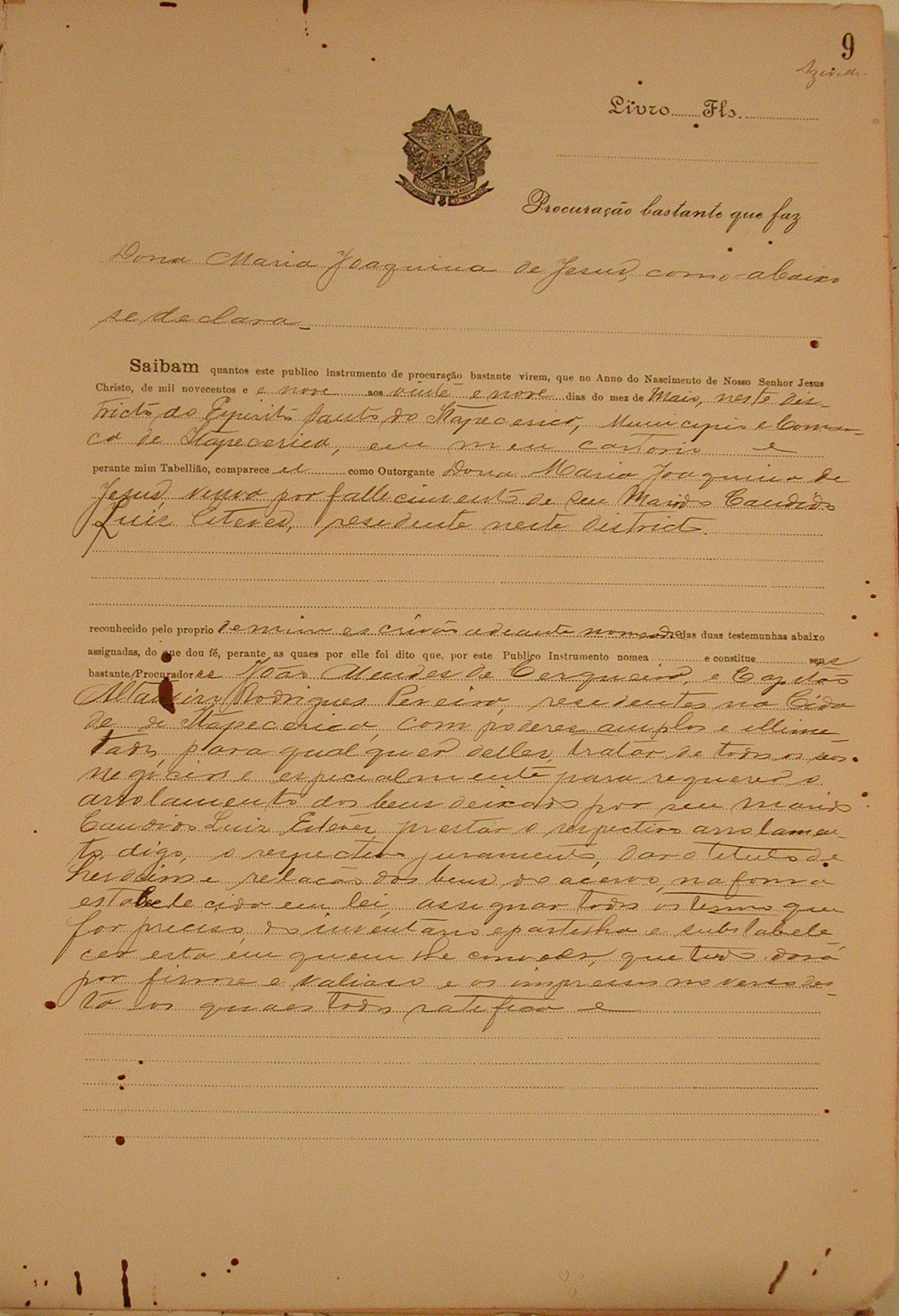 PROCURAÇÃO BASTANTE QUE FAZ MARIA JOAQUINA DE JESUS, NOMEANDO COMO SEU PROCURADORES JOÃO MENDES DE CERQUEIRA E CAPITÃO ALTAMIRO RODRIGUES PEREIRA COM PODERES PARA TRATAR DE TODOS OS SEUS NEGÓCIOS E REQUERER ARROLAMENTO DOS BENS DEIXADOS POR SEU MARIDO CANDIDO LUIS ESTEVES.